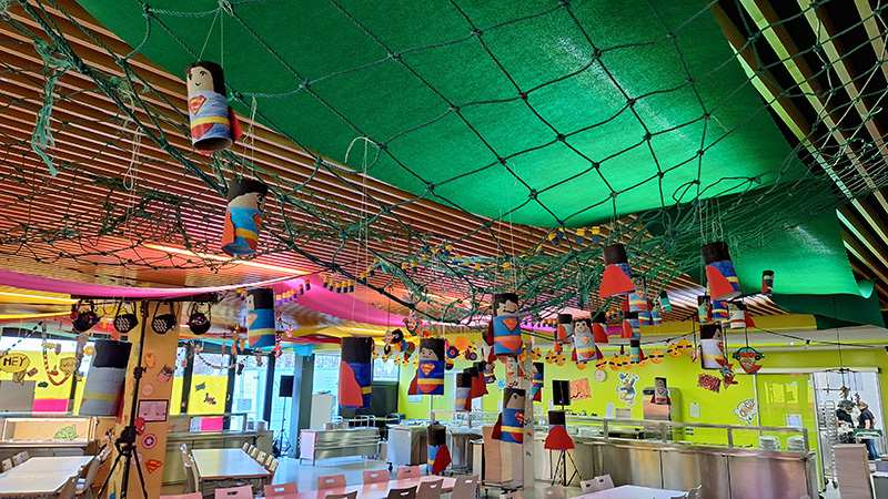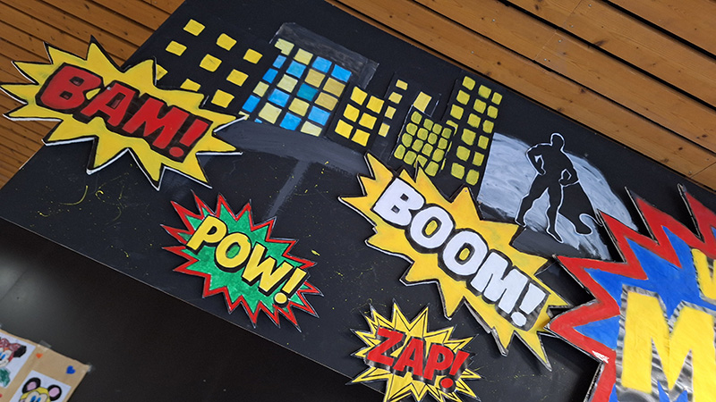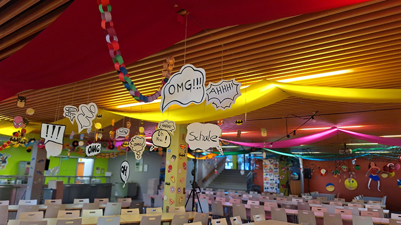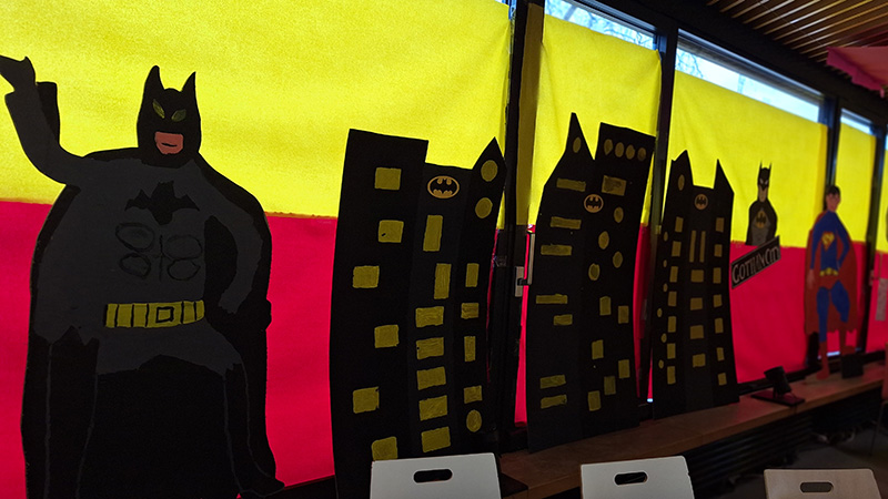 Ein großes Dankeschön gilt auch den Klassen 1-6, die mit ihren Klassenlehrerinnen, in Kunstunterricht, AG und GTA gebastelt und gemalt haben, damit die Mensa zur Superhelden-Arena werden konnte.