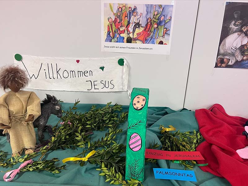 Erzählt wurde die Geschichte vom Palmsonntag, als Jesus auf einem Esel reitend in Jerusalem mit Palmzweigen begrüßt und als Messias gefeiert wurde. Die Klasse stellte hierfür selbst Palmzweige und eine Fahne her und überlegte gemeinsam: "Was würden wir machen? Was würden wir hinlegen?"