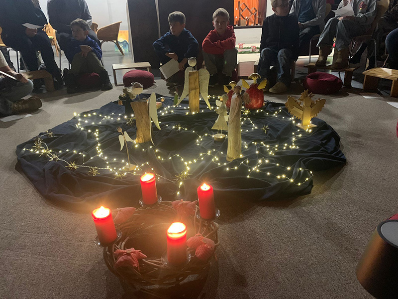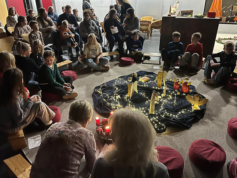 Bereits um 6.30 Uhr füllte sich der Parkplatz nach und nach, bei Beginn der Frühschicht um 6.45 Uhr passten kaum noch Menschen in den dunklen und nur von Kerzenschein und Lichterketten stimmungsvoll beleuchteten Raum. Wir freuten uns sehr über die großartige Resonanz auf unsere Einladung und nahmen unter den zahlreichen kleinen und großen Besuchern einen Wunsch nach Besinnlichkeit, Ruhe und Frieden wahr. Gespannt lauschten sie den liebevoll vorbereiteten Frühschichten und wurden auch Teil von ihr, indem Texte gelesen, Fragen beantwortet und gemeinsam gesungen wurde.