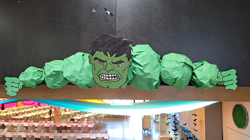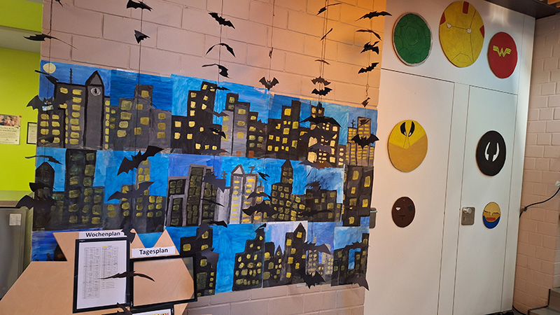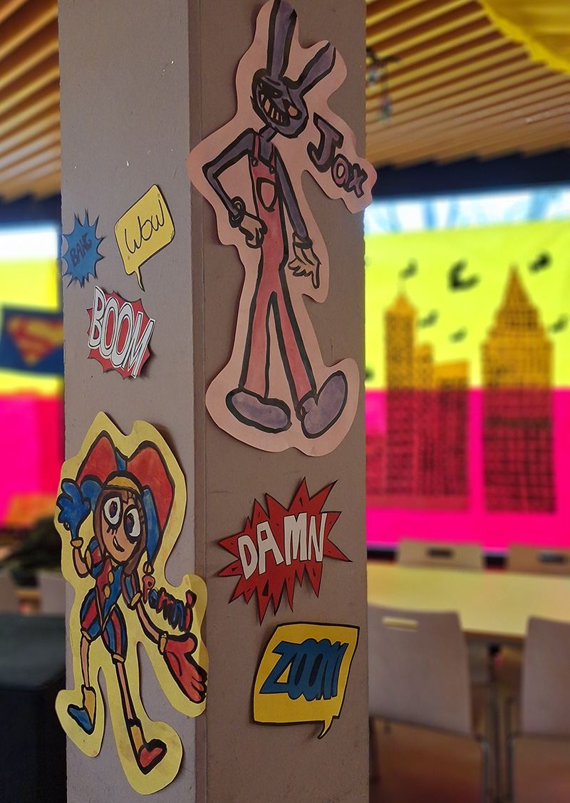 Ein großes Dankeschön gilt auch den Klassen 1-6, die mit ihren Klassenlehrerinnen, in Kunstunterricht, AG und GTA gebastelt und gemalt haben, damit die Mensa zur Superhelden-Arena werden konnte.